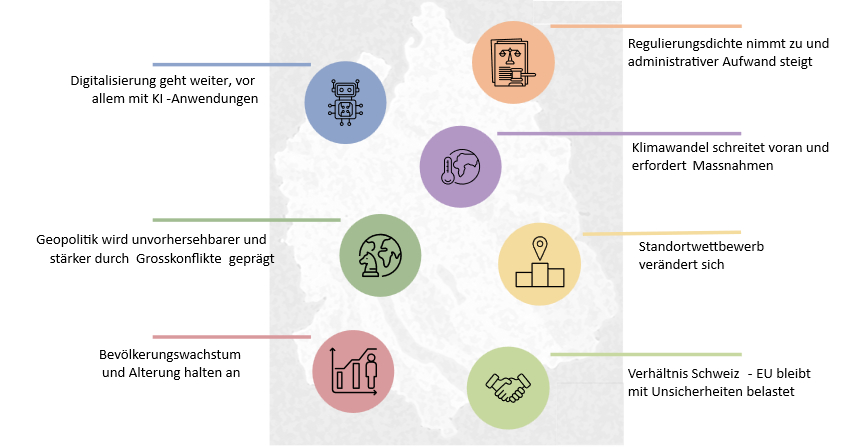Von den sieben Trends werden vier als besonders tiefgreifend für den Wirtschaftsstandort angesehen. Die Folgen dieser Trends, die Herausforderungen sowie die Handlungsmöglichkeiten für den Kanton wurden vertieft herausgearbeitet und untersucht – und werden im Folgenden beleuchtet: